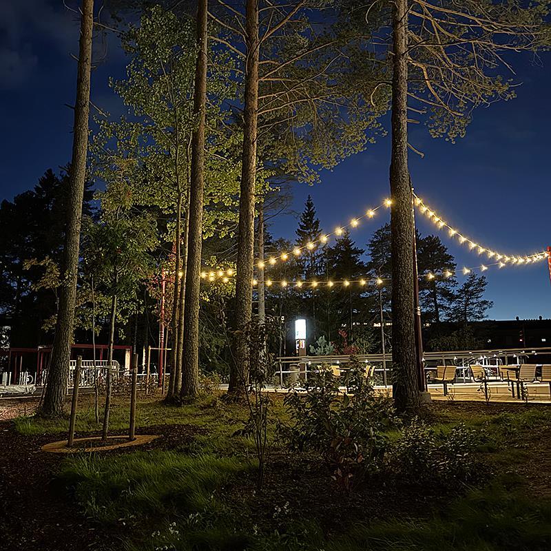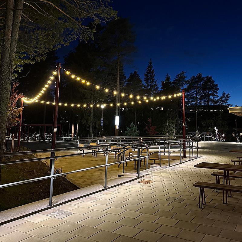 Tyréns landskapsarkitekter fick uppdraget att gestalta de exteriöra miljöerna och en av dem var en samlingsplats för studenterna. Caroline Långström, ljusdesigner på Tyréns, kommenterar lösningen: