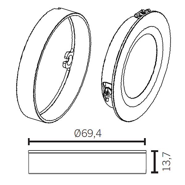 Armaturen är konstruerad så att den antingen kan ytmonteras med kabelgenomföring på ovansidan eller genom armaturens sida, eller fällas in helt med håltagning Ø65mm.