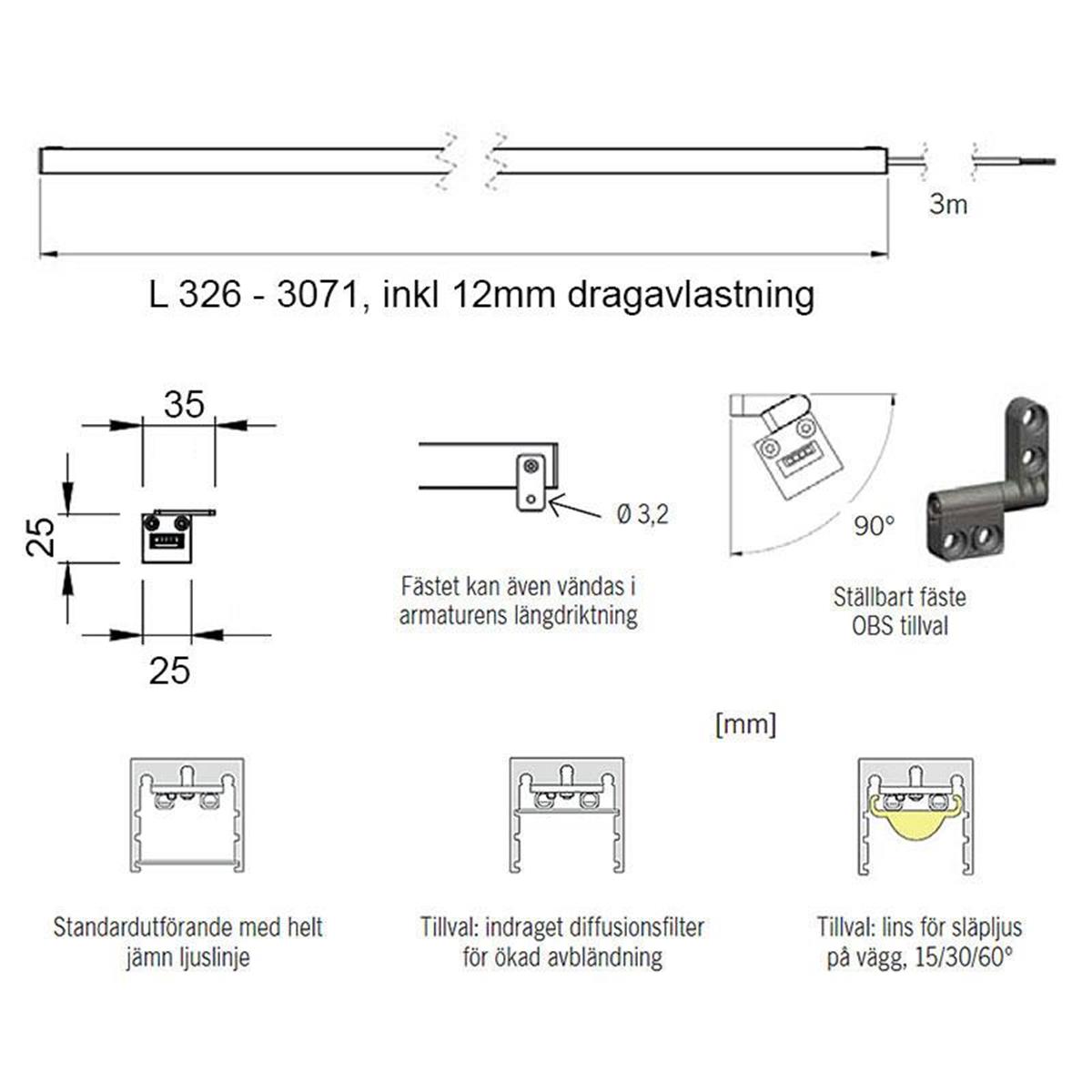 Egenskaper Smäcker och tunn design LED 48VDC filtrerad 2200 / 2700 / 3000 / 4000K standard 230V till extern driver on/off, DALI eller Casambi Förberedd för rampning, maxlängd per matning 15m Tillval: Tunable white 2700-6500K Tillval: Andra färgtemperaturer eller RGB Bilder