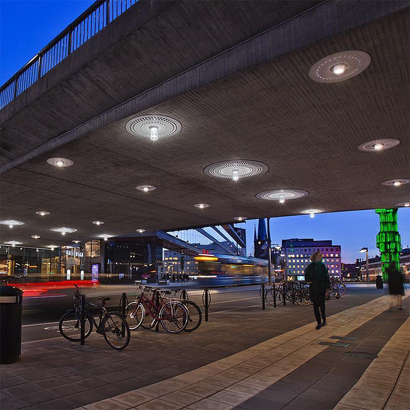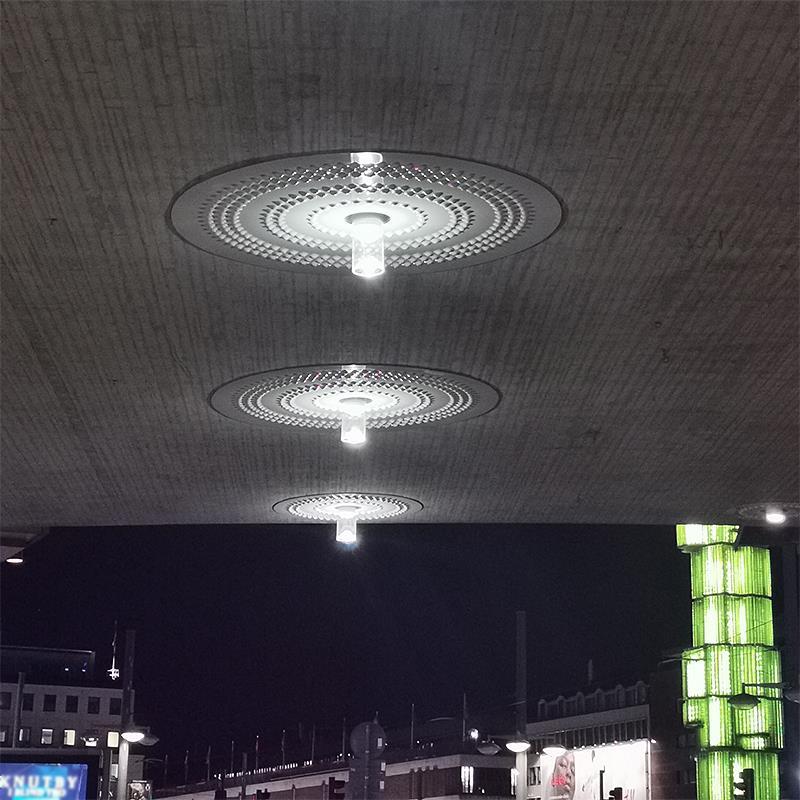 Armaturvalet föll på downlighten Super, som egentligen är avsedd för diktmontering. Den fälldes in i bron och som dekorativt inslag ramades den in av stora vitlackerade fiberbetongskivor som reflekterar ljuset. För att göra installationen ännu mer anslående monterades under vissa armaturer en plastcylinder med en konkav spegelreflektor nedtill, vilket både reflekterar ljuset uppåt och ger installationen ett gnistrande intryck - ett unikt inslag i trafikmiljö.