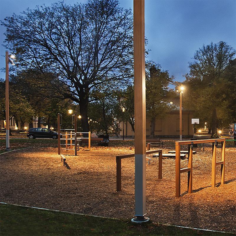 Parken belyses av strålkastare (inte från Flux) monterade parvis i toppen av fem meter höga trästolpar. Stolpen heter Ruka och kommer från Tehomet. Den är kvadratisk 140x140mm och infärgad i kulören Cinnamon för att matcha träningsredskapen.